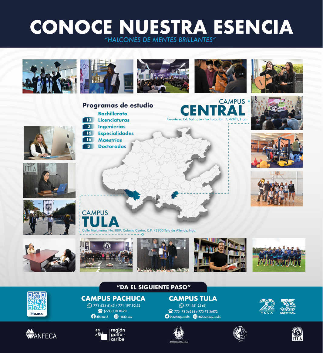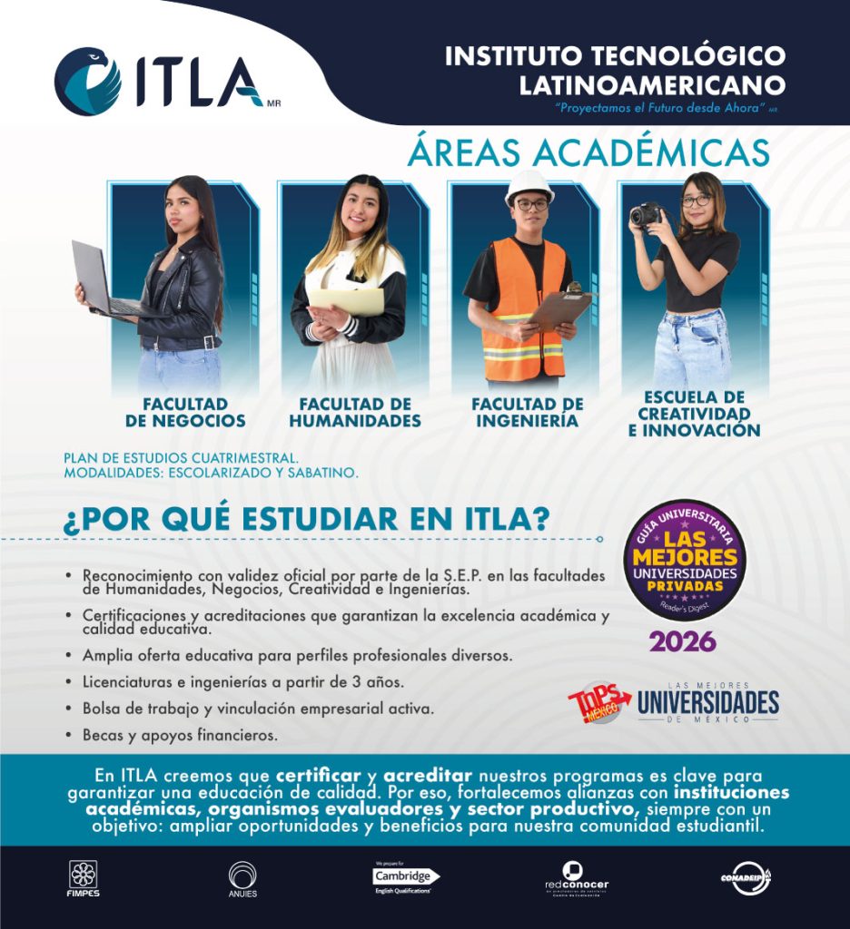 Instituto Tecnológico Latinoamericano (ITLA) es una institución privada ubicada en Pachuca de Soto, Hidalgo, México, fundada en 1992 por el doctor Andrés Federico Acosta Castañeda y sus hijos. Cuenta con dos sedes, el Campus Tula y el Campus Pachuca, y ofrece estudios a nivel de bachillerato, licenciaturas, ingenierías, especialidades, maestrías y doctorados. Entre sus programas se incluyen Ingeniería Civil, Ingeniería Industrial, Ingeniería en Tecnologías de la Información, Licenciatura en Logística, Turismo Sustentable, Relaciones Públicas y Comunicación, Música Contemporánea, Contaduría, Derecho, Psicología, Diseño Gráfico, Arquitectura y Educación. La institución es acreditada por la Federación de Instituciones Mexicanas Particulares de Educación Superior (FIMPES) y se posicionó entre las mejores universidades del país según el ranking QS Top Universities en 2020. Además, se encuentra en el primer lugar en la Red de Sustentabilidad de ANUIES por su compromiso ambiental.