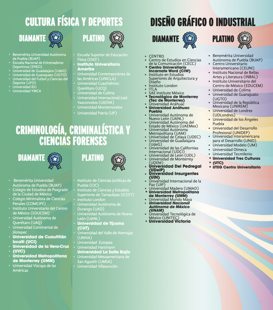 Presentamos a las mejores universidades de México, edición 2023. Conoce las casas de estudio más destacadas por carrera y especialidad. Seleccionamos a las instituciones de educación superior más prestigiadas y con mayor reconocimiento en cada área profesional. Mira la lista de universidades galardonadas en la categoría Diamante.