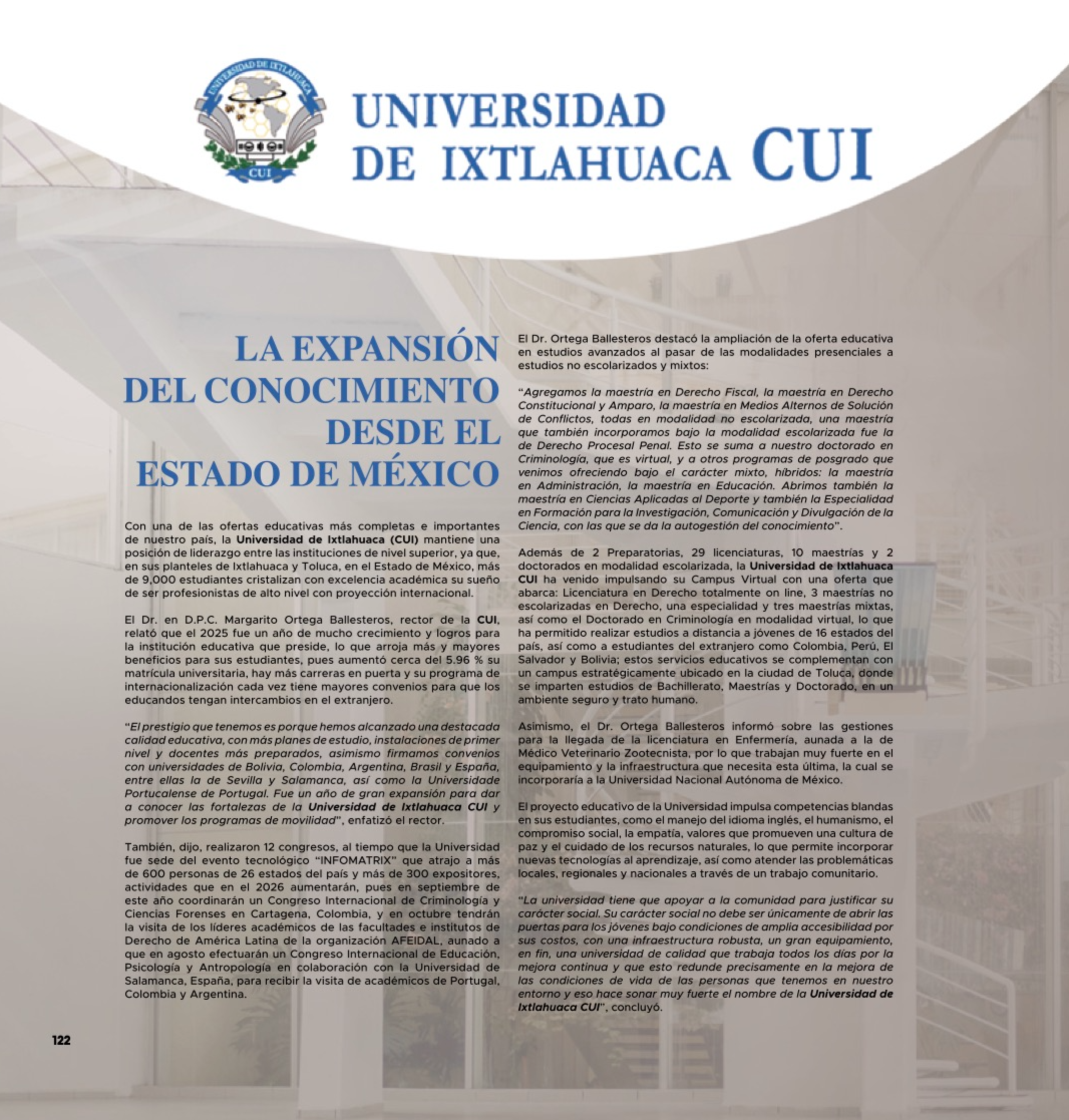 Este año el CUI impulsará programas vigorosos de movilidad para seguir con la internacionalización, “Algunos estudiantes van a estar, en el mes de marzo, en Sevilla, en Abu Dabi, es decir, países árabes. Esto significa que la comunidad estudiantil tiene una proyección internacional que le da honor, orgullo y lustre a la Universidad de Ixtlahuaca”, compartió el Dr. en D.P.C Margarito Ortega Ballesteros.